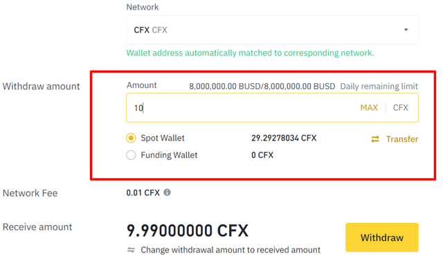 - Enter the amount of CFX you want to transfer in the "Amount" field.
